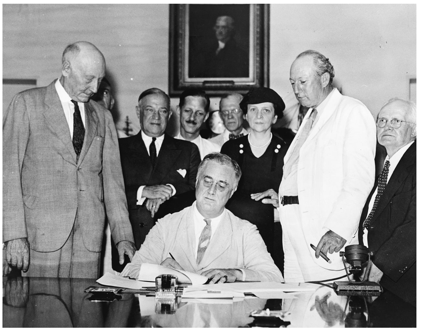 President Franklin D. Roosevelt signing the Social Security Act on August 14, 1935. (Pictorial Press)
